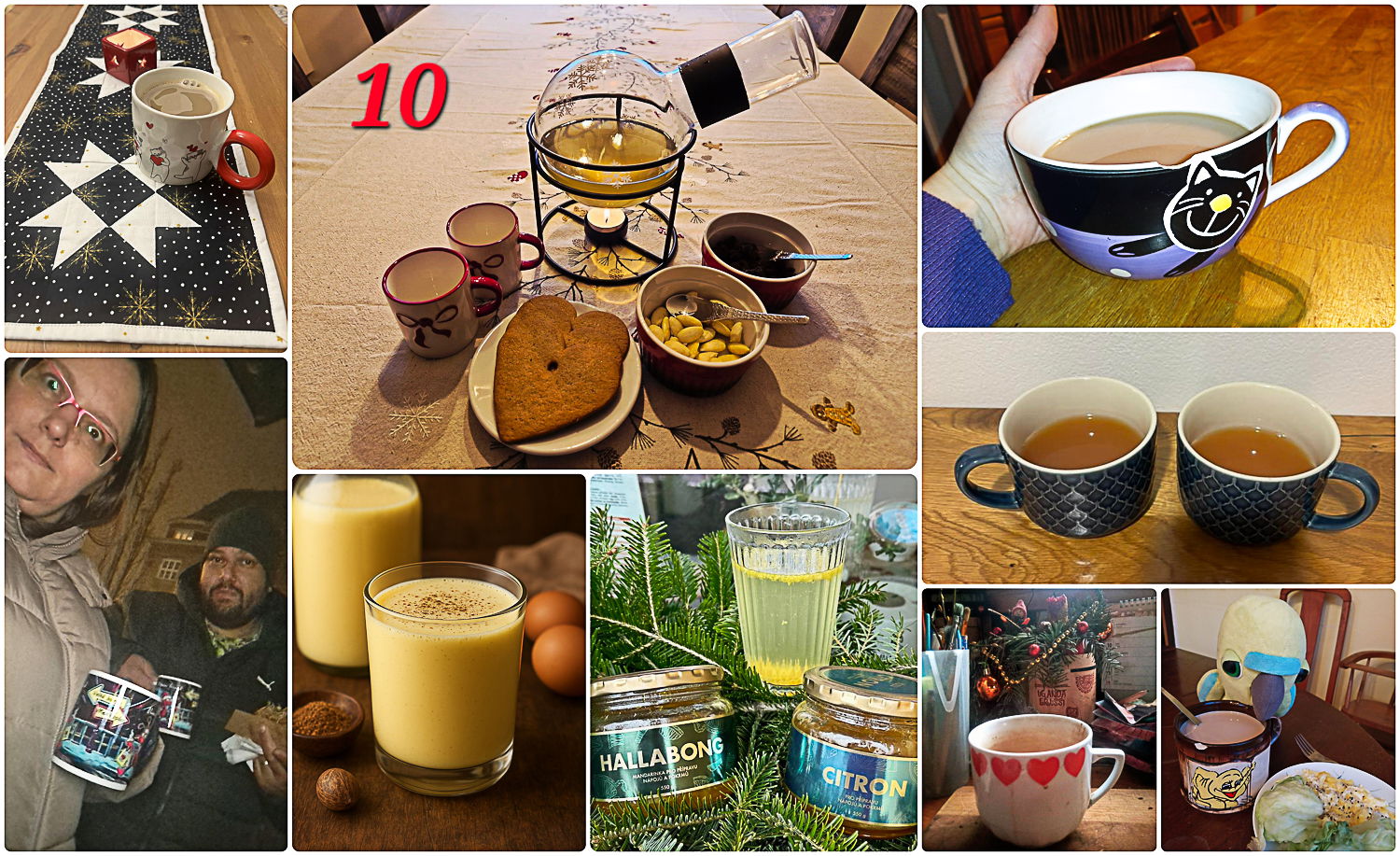 Můj nejoblíbenější horký adventní nápoj je švédský Glögg :-)). Je to něco jako svařené víno v Česku, taky na bázi vína (červené i bílé, já mám raději bílé) nebo v nealkoholické verzi ovocná šťáva, a koření – skořice, hřebíček, kardamom, zázvor, pomerančová kůra. Přidávají se do něj mandle a rozinky, dle chuti, a přikusuje se zázvorový perníček.