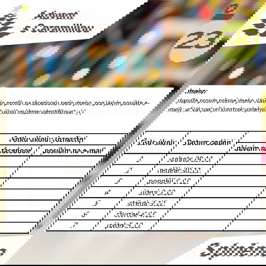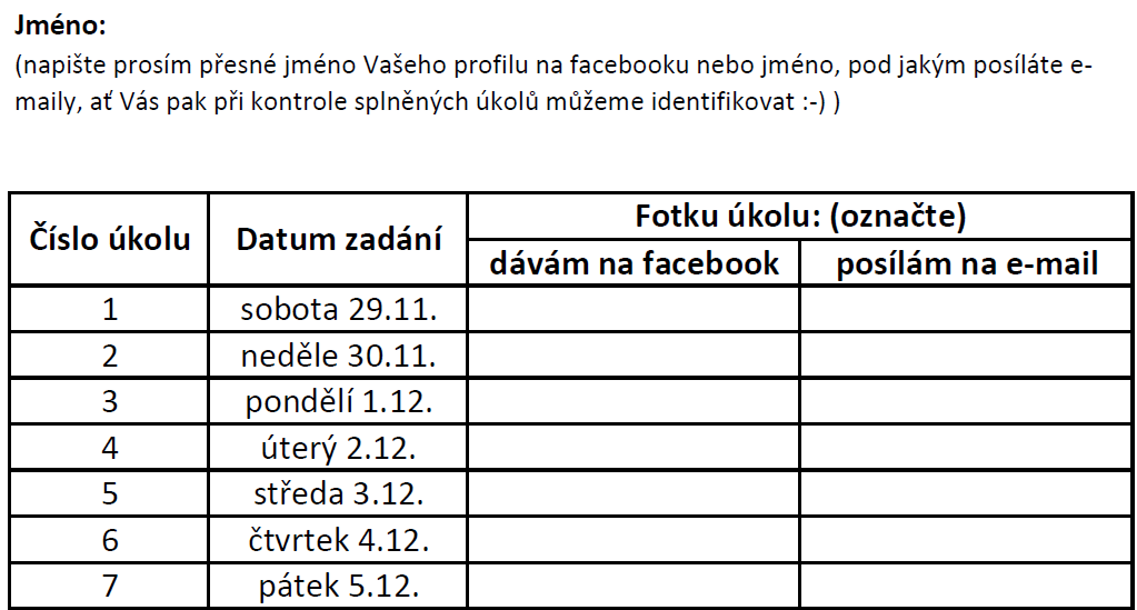 Komu se tedy povedlo splnit všechny úkoly, pošlete na e-mail jana@caramilla.cz vyplněnou tabulku. Vůbec nevadí, pokud jste úkoly nesplnili v den zadání, i dodatečné se počítají :-).