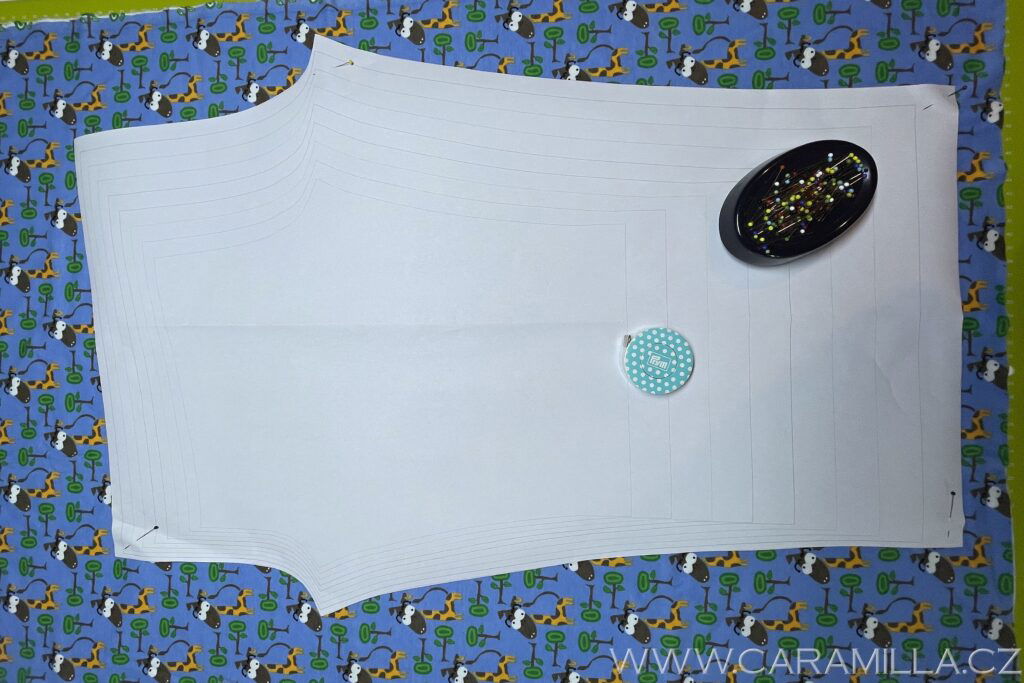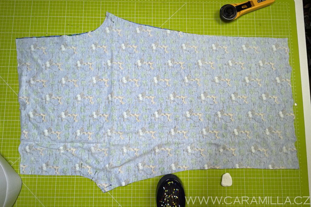 Střih naneseme na látku – pokud máme jednosměrnou, tak polohujeme oba díly jedním směrem – zde je látka přehnutá a budu stříhat zároveň dva díly zrcadlově. Pokud máte vzor cik-cak, trochu menší spotřeba je, když si dáte druhý díl opačně – ale pozor na střih dílu zrcadlově!