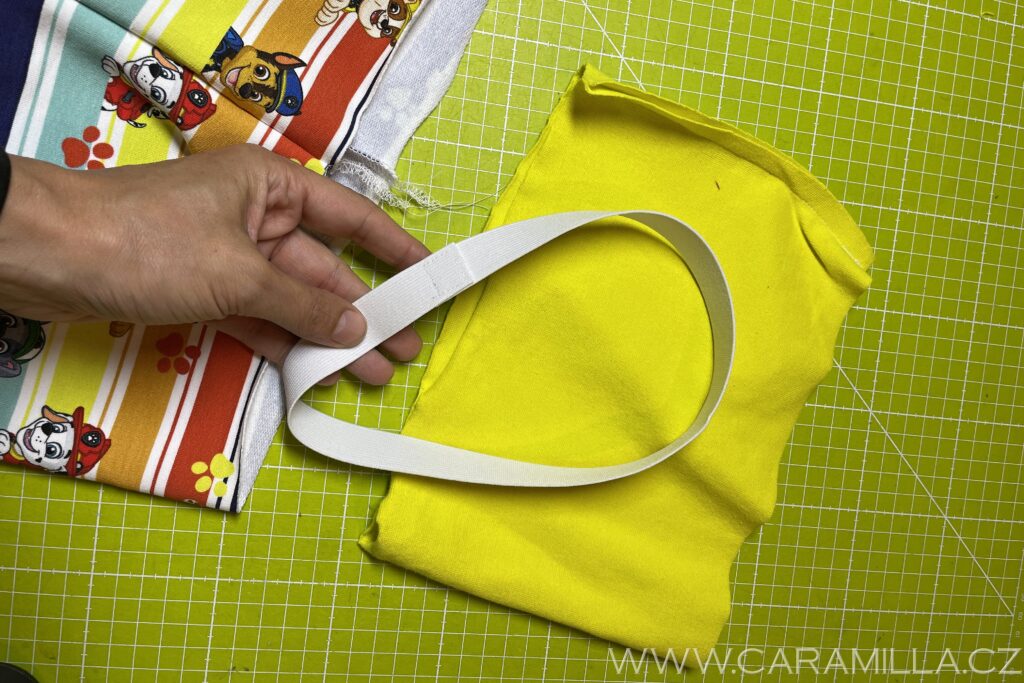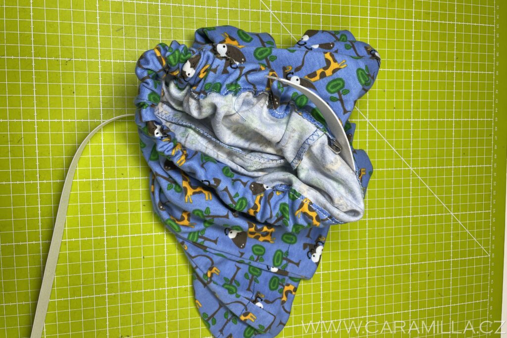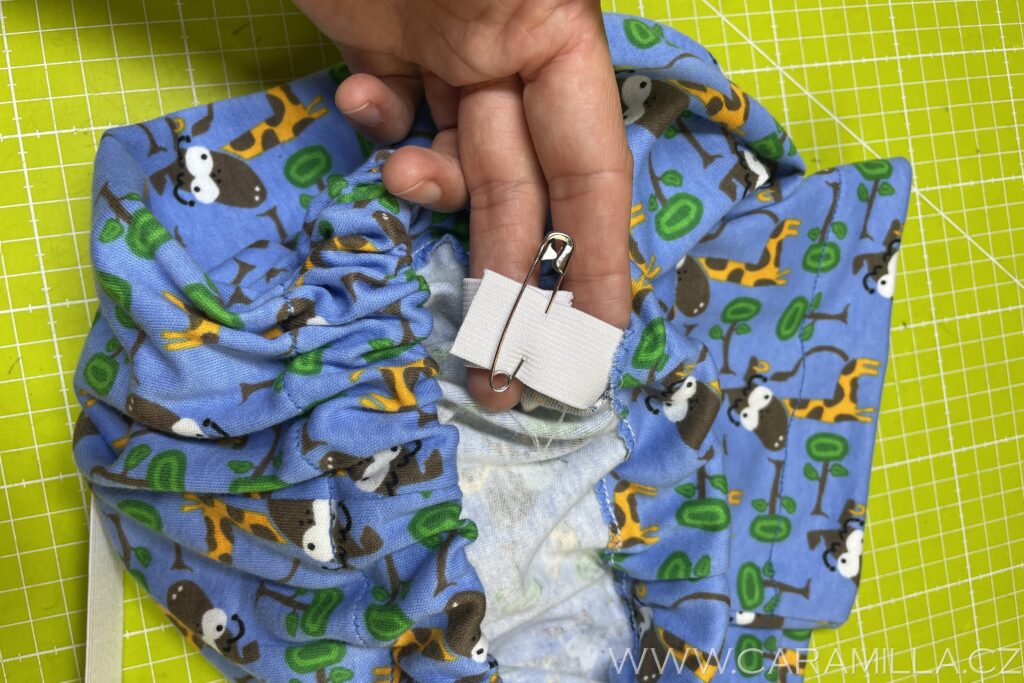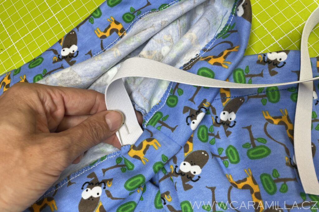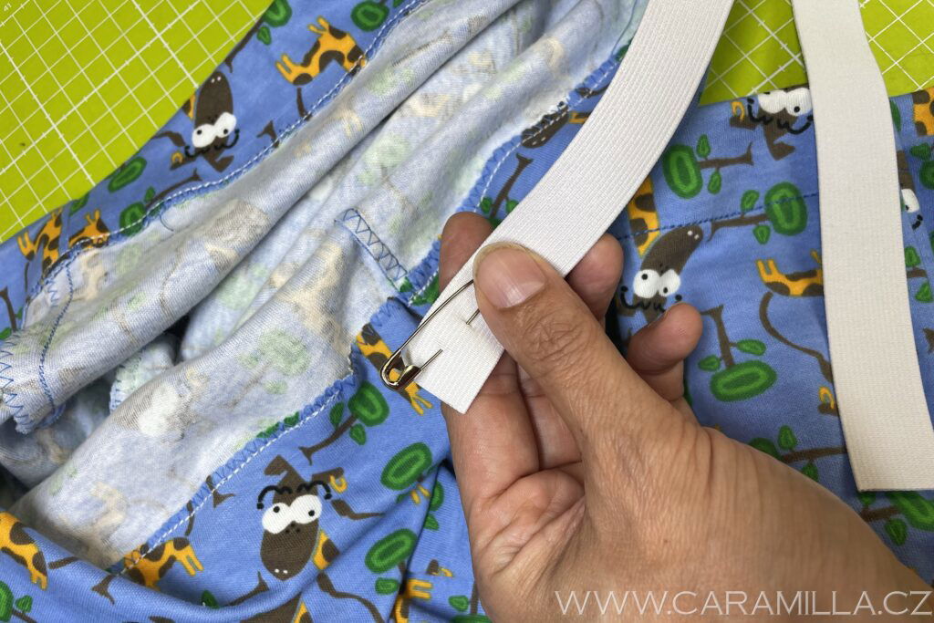 Nyní navlečeme pruženku – tu si odměříme podle pasu dítěte (já mám pro Jakuba 128 vel. 48 cm + kus na sešití).