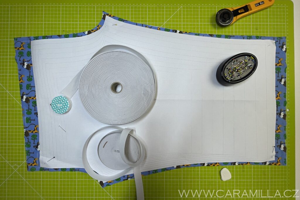 Kromě látky budete potřebovat ještě pruženku do pasu a případně náplet. Do pasu můžete použít dětskou plochou pruženku 2 cm nebo galonovou pruženku 3 cm.