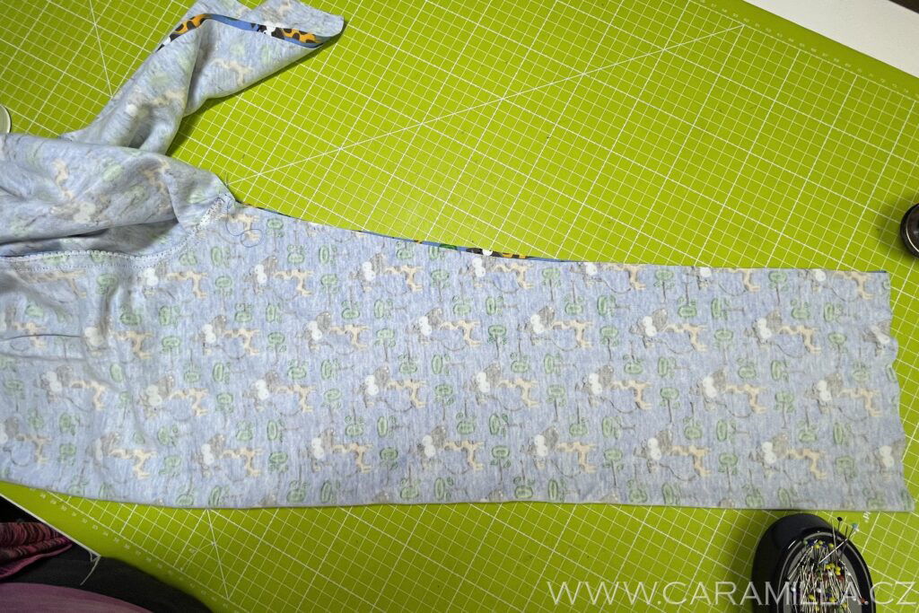 Náplety si sešijeme rovným stehem dokola. Jsou užší jak spodky nohavic, což je v pořádku, aby držely nohavici nad kotníkem.
