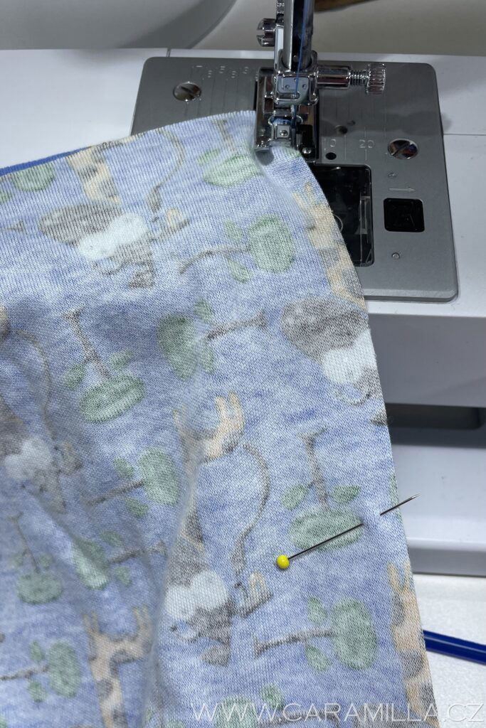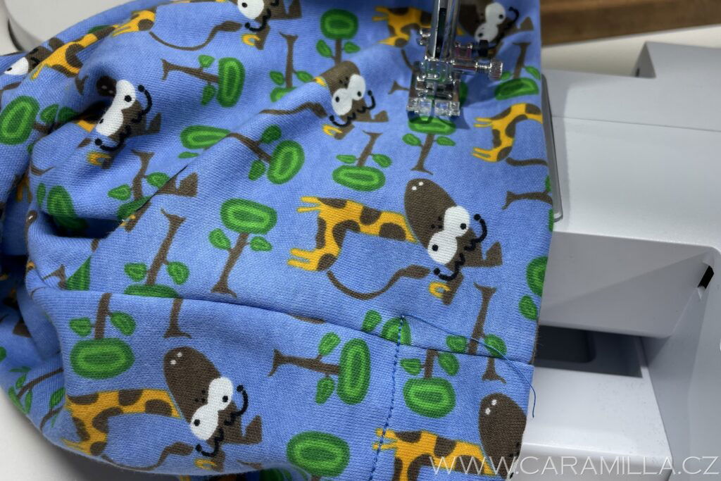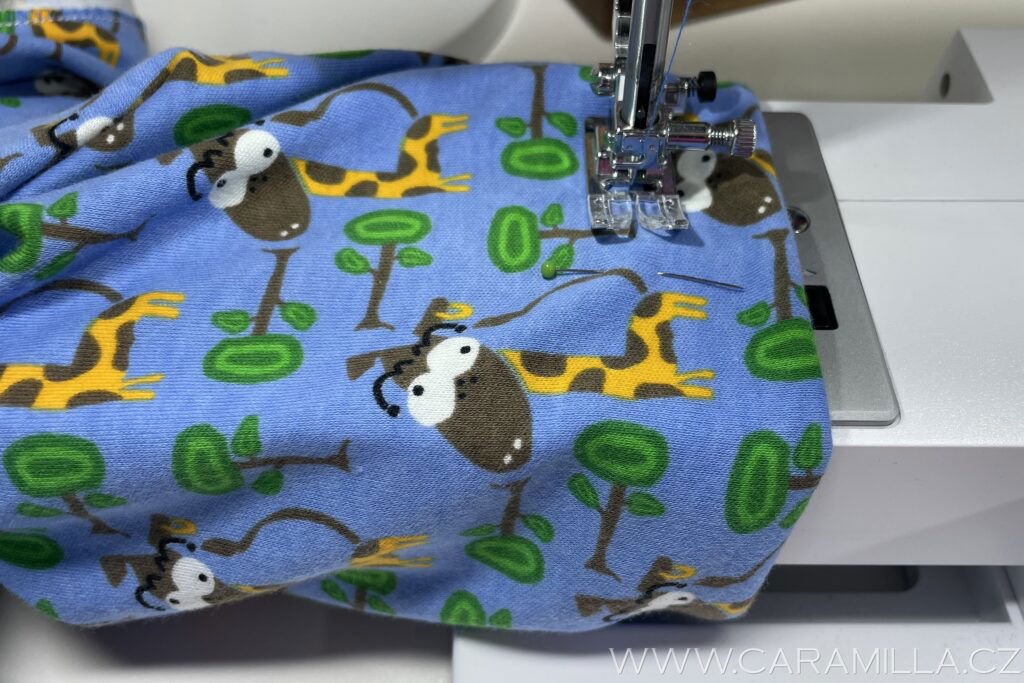 Využijeme volné rameno a šijeme dokola z lícu pružícím stehem.