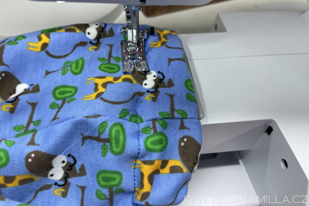 Nyní zbývá došít otvor. Můžeme dát i obyčejný delší steh, aby se otvor lépe páral pro možnost výměny pruženky – třírovný pružný steh se špatně páře.