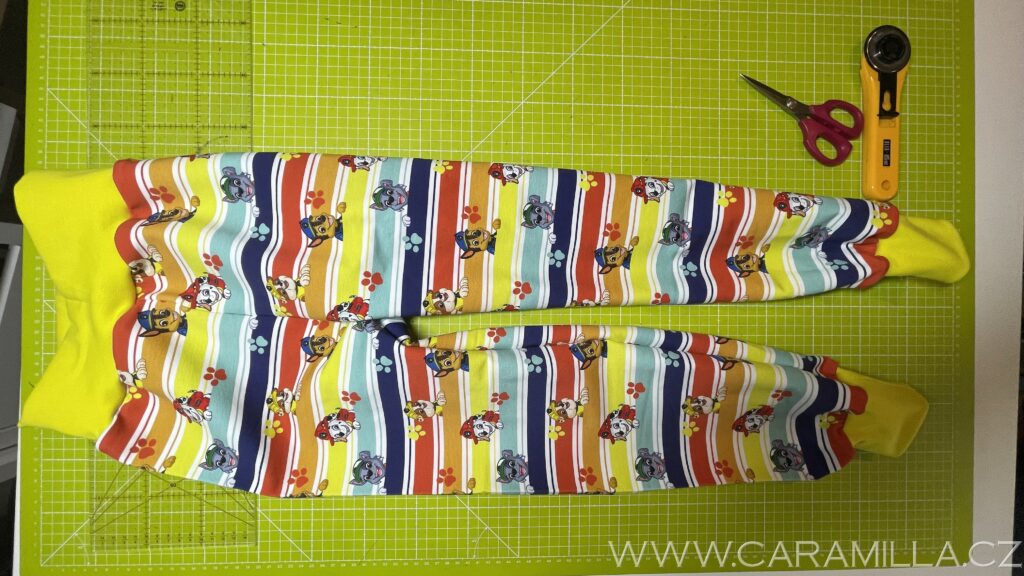 Dole na nohavici přidáme asi 3-4 cm a jinak rovnoměrně na švy dle toho, jaké stehy budeme využívat. Více uvidíte ve videu.