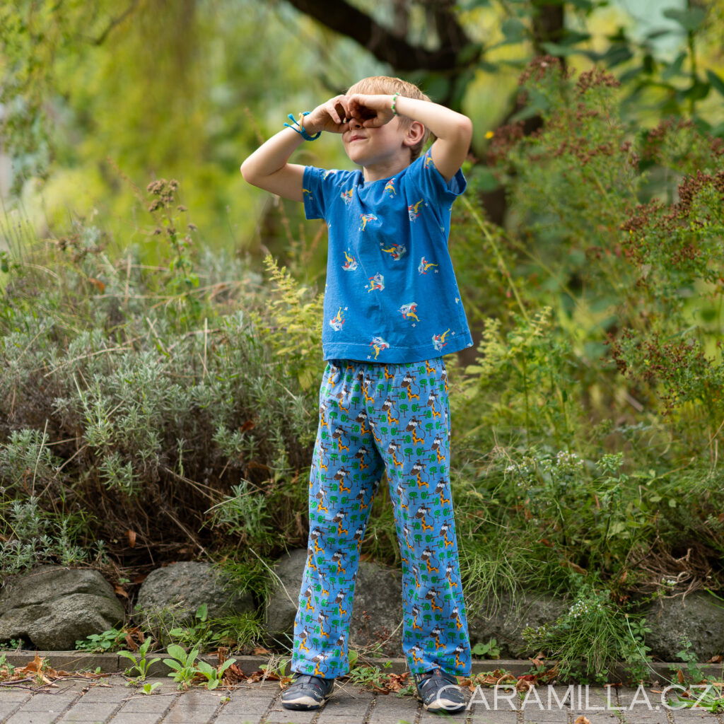 Kalhoty můžete šít víceméně “z jakéhokoliv materiálu”. Číslované jsou jako volné kalhoty z úpletu – aby byly pohodlné na spaní i pohyb. Záleží samozřejmě na konstituci postavy dítěte.