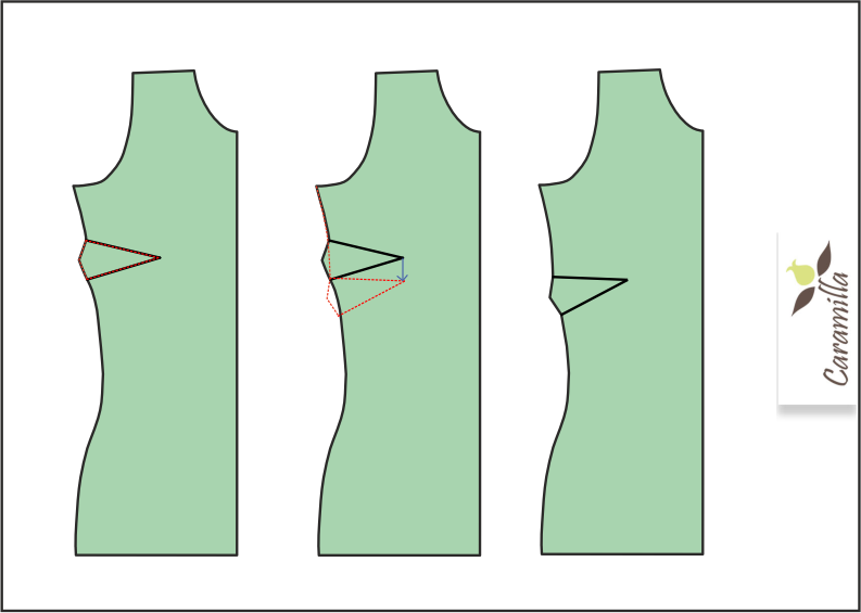 Zde je mnohem jednodušší úprava, kterou můžete zkusit použít, nemám ji ráda, já raději záševek, ale je mnohem jednodušší. Ve střihu přidáte o kousek víc “do boule” kolem prsou. Tuto úpravu použijte, pokud si na úpravu na záševek netroufáte a potřebujete rozšířit prsa o maličko a máte pružící látku (úplet s elastanem!). Do zadního dílu lze toto místo i mírně navolnit.