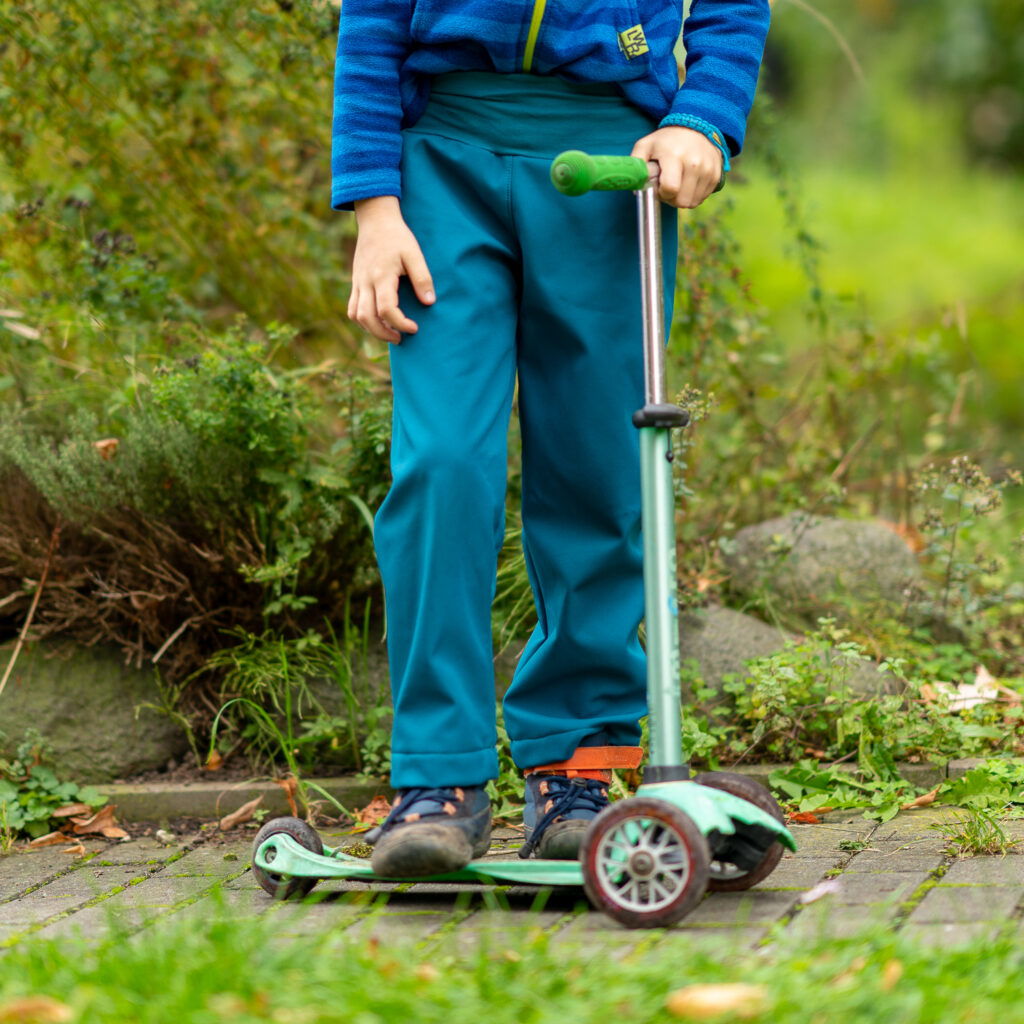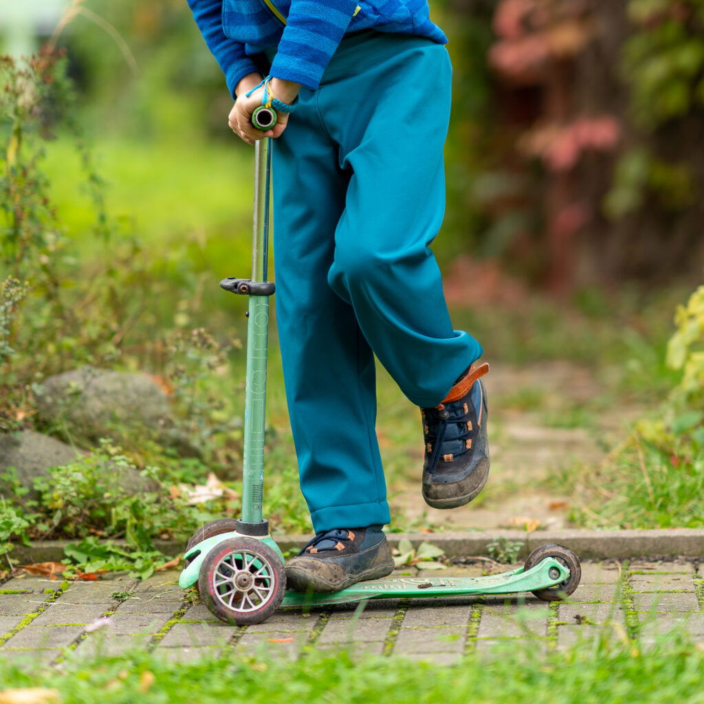 Kalhoty můžete šít víceméně “z jakéhokoliv materiálu”. Vhodné jsou pro softshell, ale i jakoukoliv jinou tkaninu (plátno, kepr, riflovinu, silver, mušelín, gázovinu,…). Skvělé z nich jsou i tepláky – budou při výběru běžné velikosti trochu volnější. Šít je můžete z úpletu, teplákoviny, flízu, warmkeeperu, … Záleží samozřejmě na konstituci postavy dítěte, ale třeba z úpletu budou celkem volné.