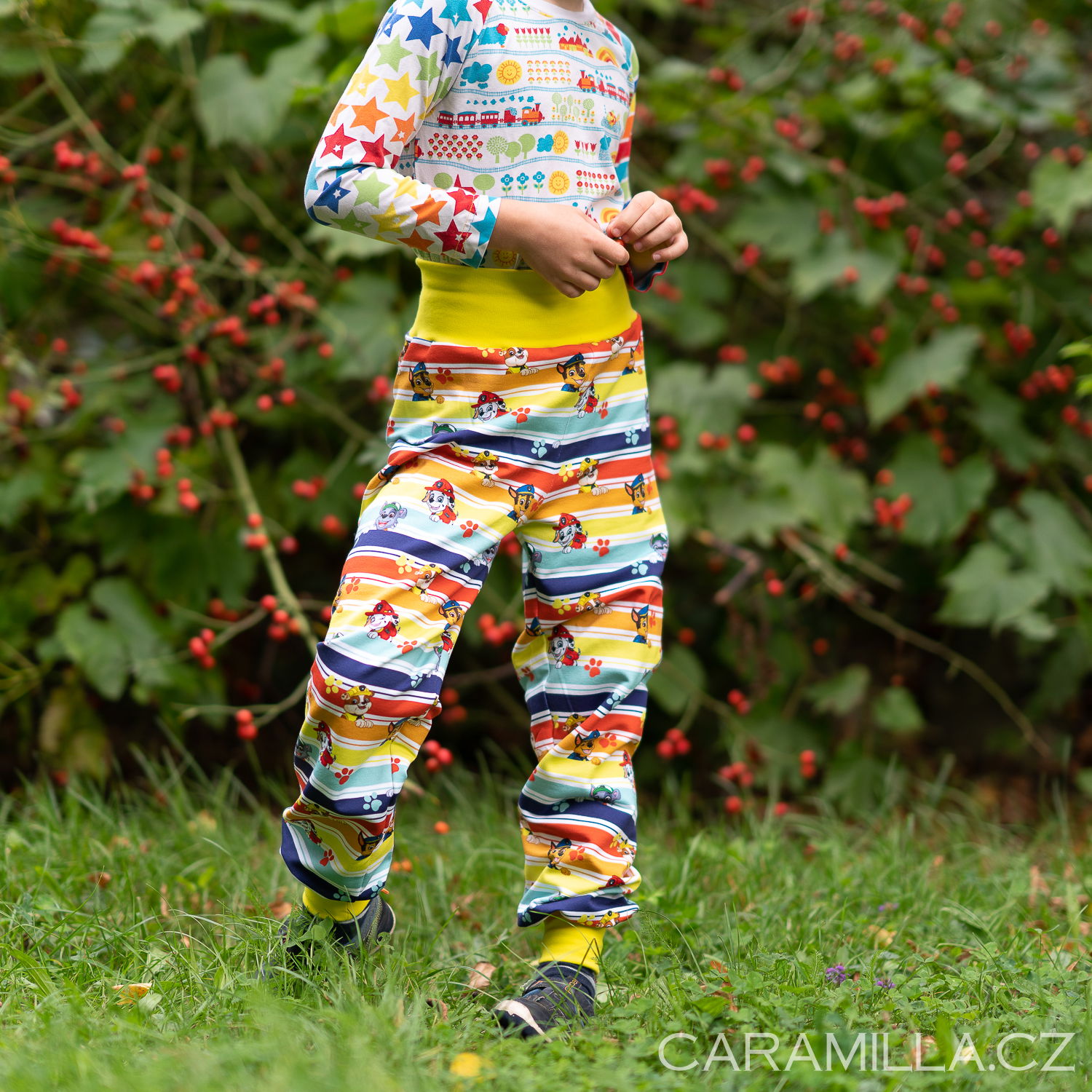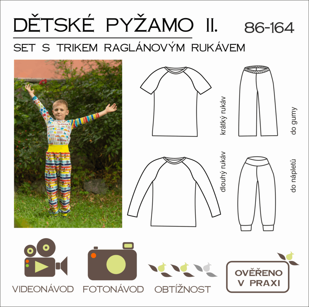 SET vhodný na šití PYŽAMA: Střih na triko s raglánovým rukávem (univerzální střih pro kluka i pro holku) a na pohodlné pyžamové kalhoty.