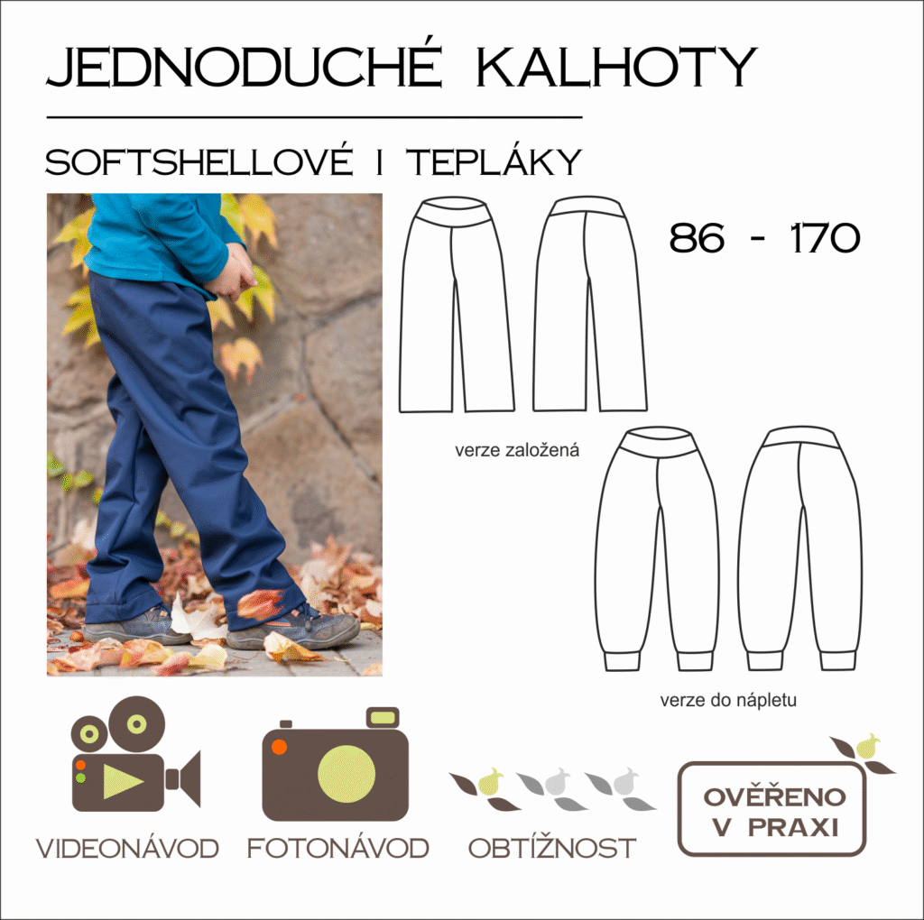 Střih na ty jednodušší softshellové kalhoty vůbec – žádné boční švy, prostě šup šup a máte hotovo! Ve velikostech 86-170. Skvělé na softshellové kalhoty, ale i jakékoliv pláťáky nebo tepláky.