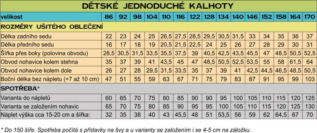 | Dětská velikost | 104, 110, 116, 122, 128, 134, 140, 146, 152, 164, 170, 86, 92, 98 |