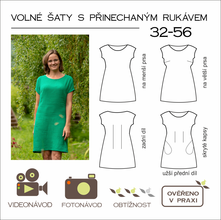 Šaty vcelku, který je vhodný pro šití z tkanin. Ideální pro mušelín. Střih je skvělý u látek, kde nechceme kazit přestřižením vzor. Střih má variantu s prsním záševkem i bez prsního záševku. Přinechaný rukáv je velmi oblíbený, protože je pohodlný na nošení.