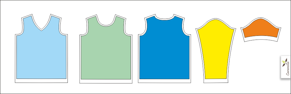 Střih na volné dámské triko, který nabízí možnost šít výstřih klasický kulatý nebo do V. Mimo dlouhý rukáv obsahuje samozřejmě také linii pro rukáv krátký.