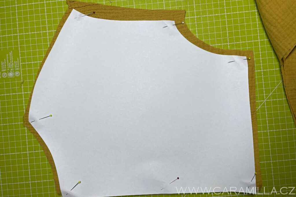 Pokud budete šít verzi s kapsami, díly kapes si v rovné straně podžehlíme vliselinovým proužkem a našpendlíme je na líc sukně. Řídíme se značkami ve střihu.