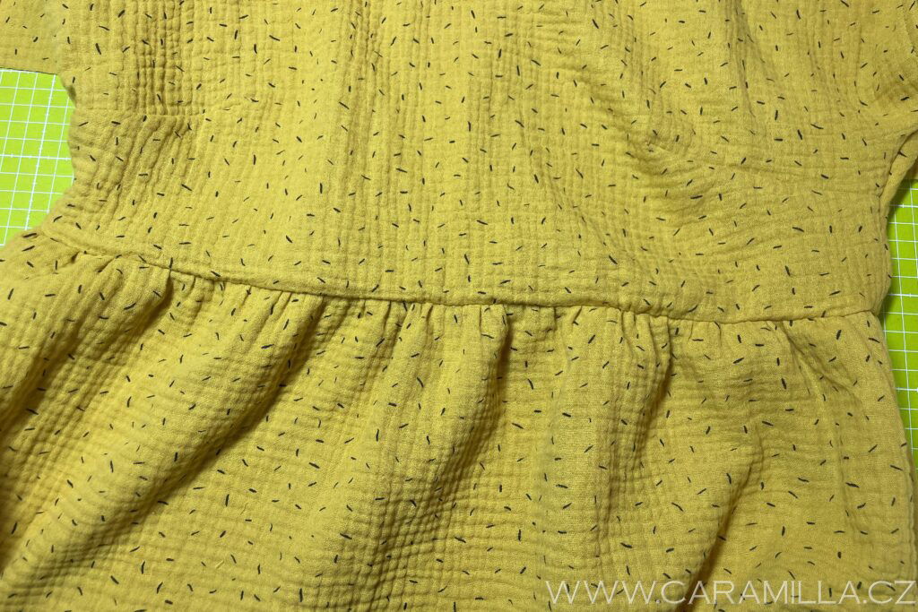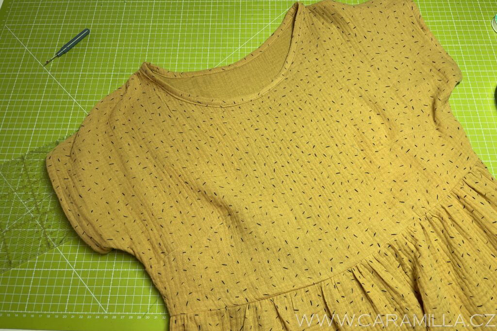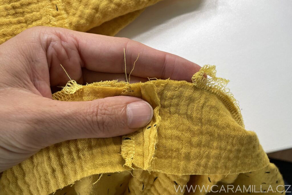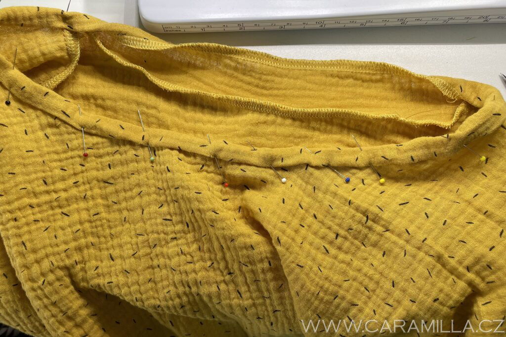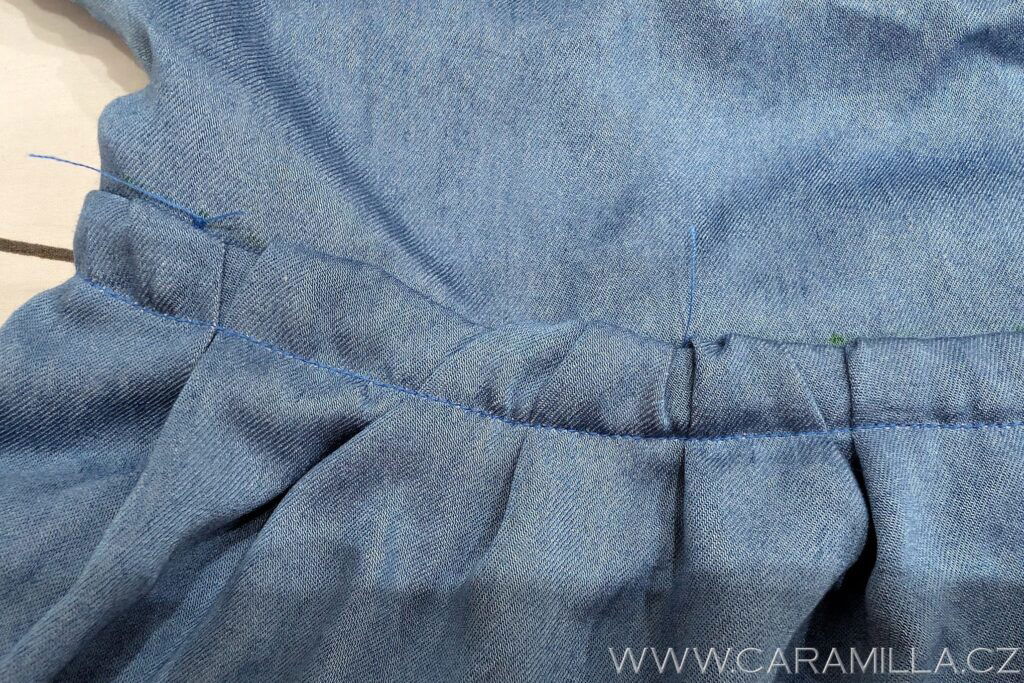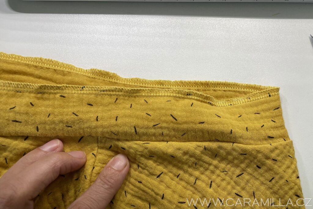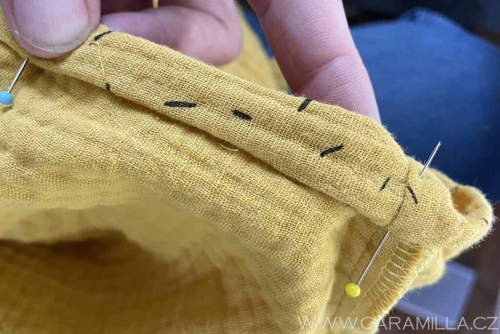 Průkrčník nejrychleji zapravíte tzv. “zahnutím” – je to metoda “na prasáka”, ale když člověk šije jen šaty na lítačku, do školky, tak je někdy za rychlá řešení typu “žaves” dost vděčný…
