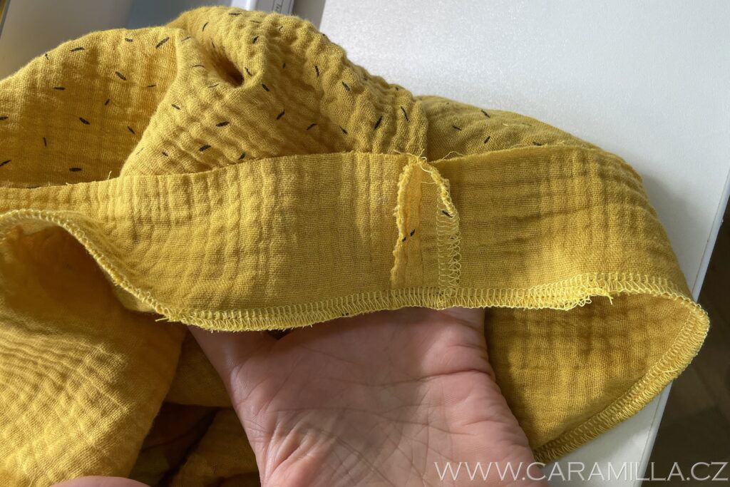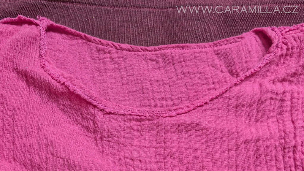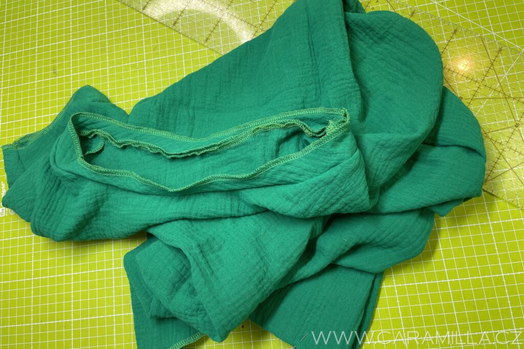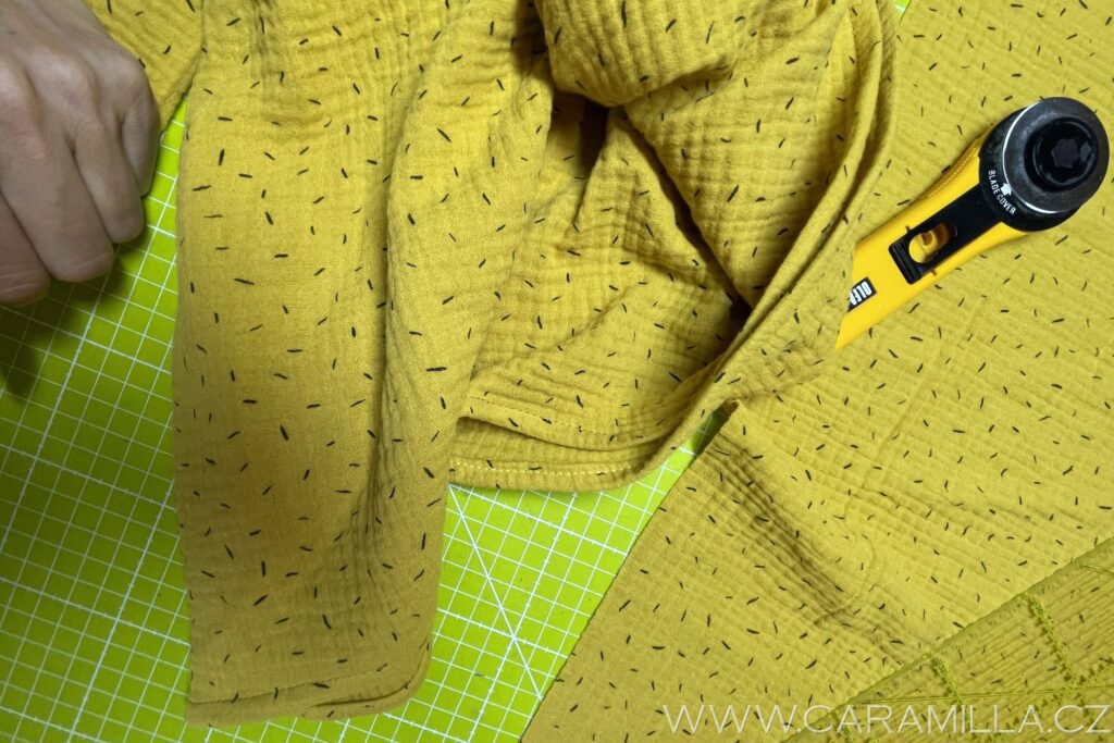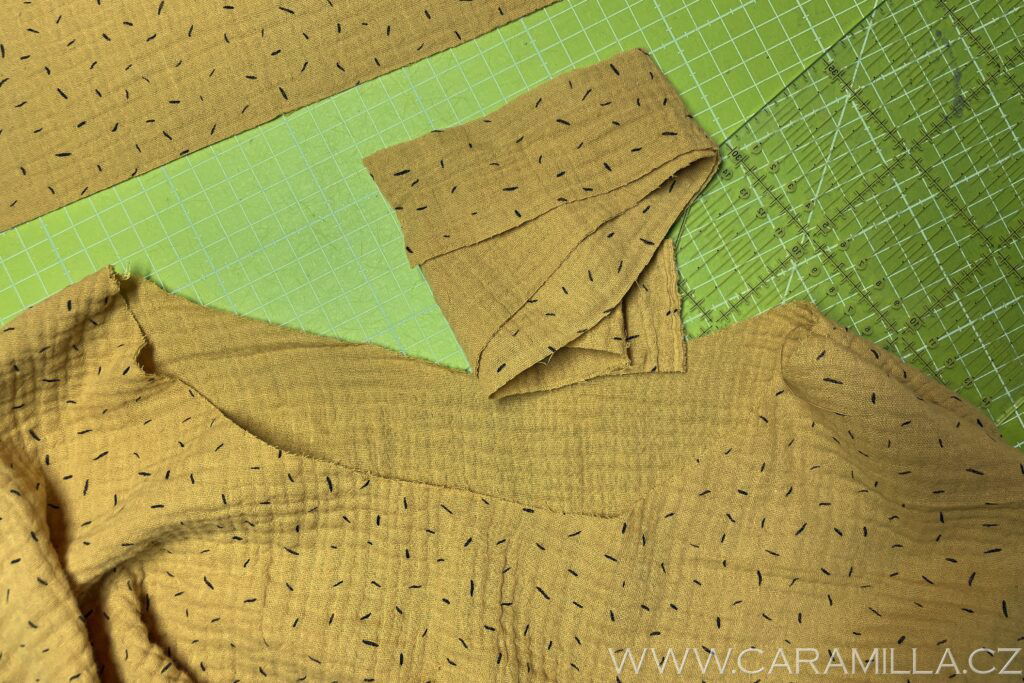 Průkrčník můžete zakončit i lemováním proužkem. U mušelínu můžete zkusit i proužek ustřihnout jen po šíři látky, trochu se natáhne díky své mačkané struktuře a lem z něj vypadá pěkně. Proužek doporučuji šířky 5 cm a délku nepočítám vzorečkem, ale první proužek našiji a pak si délku upravím, viz návod níže.