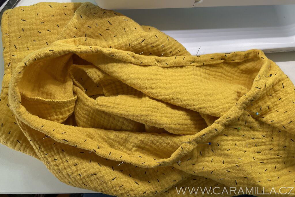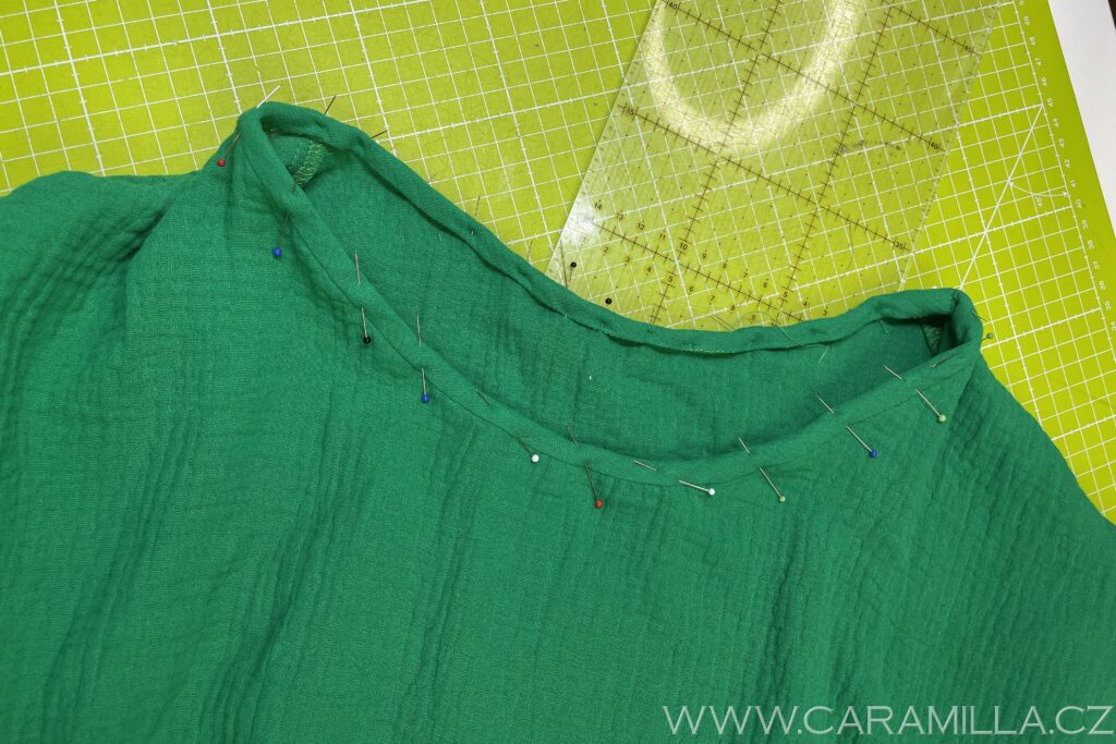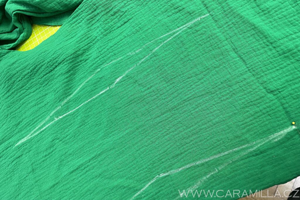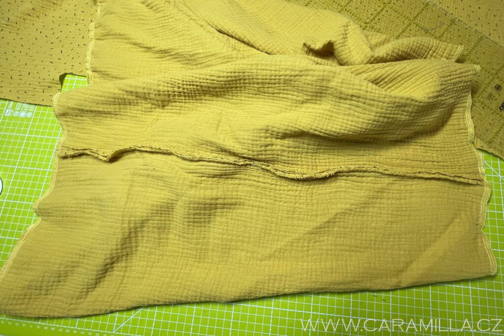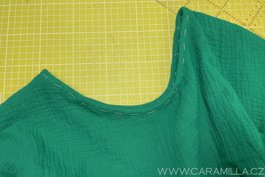 Průkrčník můžete zakončit i lemováním proužkem. U mušelínu můžete zkusit i proužek ustřihnout jen po šíři látky, trochu se natáhne díky své mačkané struktuře a lem z něj vypadá pěkně. Proužek doporučuji šířky 5 cm a délku nepočítám vzorečkem, ale první proužek našiji a pak si délku upravím, viz návod níže.