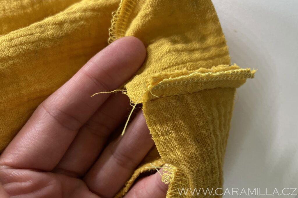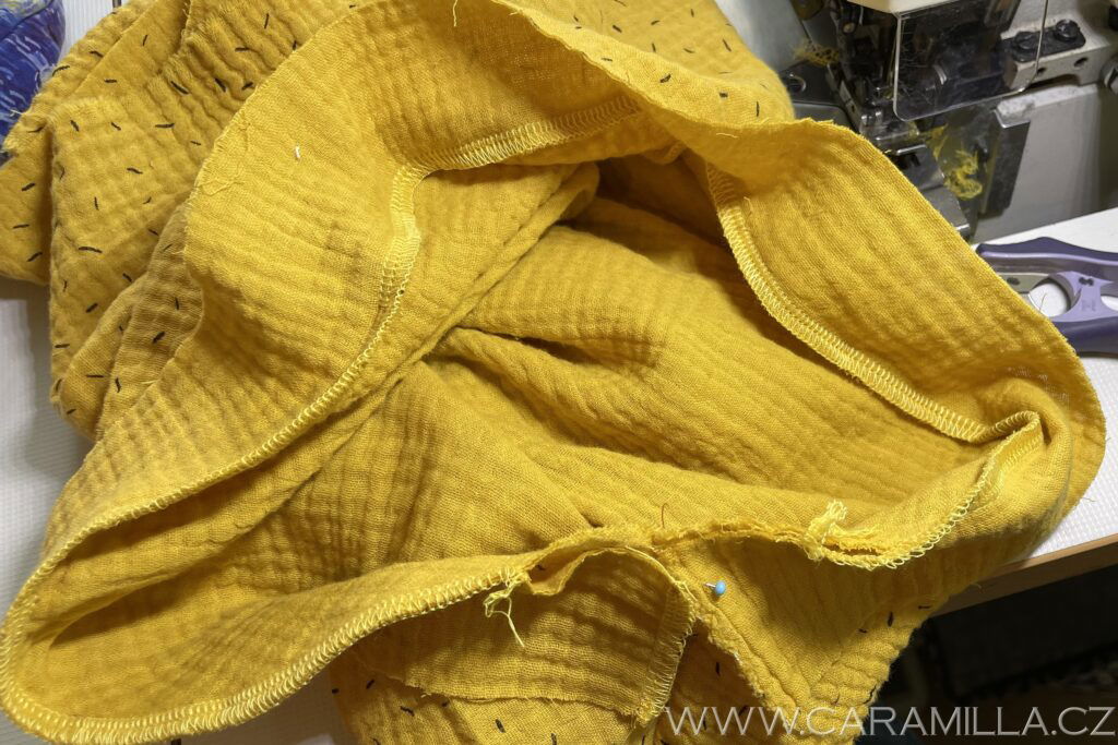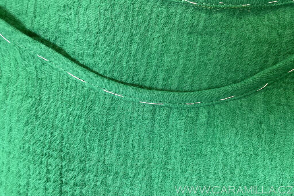 Průkrčník začistíme cikcakem a nebo overlockovým stehem, který můžeme regulovat tak, aby třeba i trochu víc mušelín stahoval než je na fotce. Když si necháte řetízek, lze natažení regulovat pak při šití – aby byl průkrčník hezky stažený a nebyl “vytahaný”.