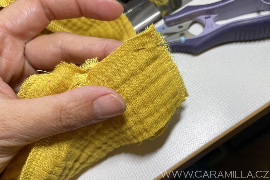 Proužek si upravíme – spojíme si ho tak, jak bude natažený, přidáme si na švy a v místě, kde bude sešit, tak si dáme špendlík. Oba konce proužku ještě začistíme overlockovým stehem nebo cikcakem – aby se nevytřepily.