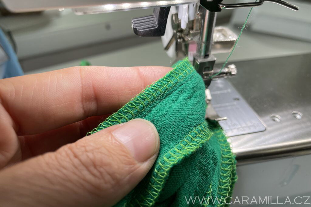 Při šití kontrolujeme, že je lem hezky dvakrát podhrnutý a nevyjíždí a ovelockový steh je schovaný.