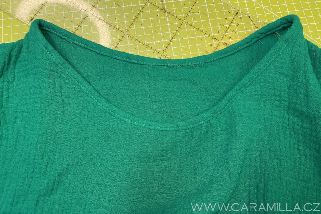Průkrčník můžete začistit kromě podsádky ještě i proužkem – buď úpletovým z viskózy (uprostřed) nebo šikmým koupeným z tkaniny (případně s podílem elastanu) a nebo vlastním ze stejného materiálu. Mušelínu dle mého názoru moc nesluší kombinace materiálů, tak jsem zvolila proužek z mušelínu.