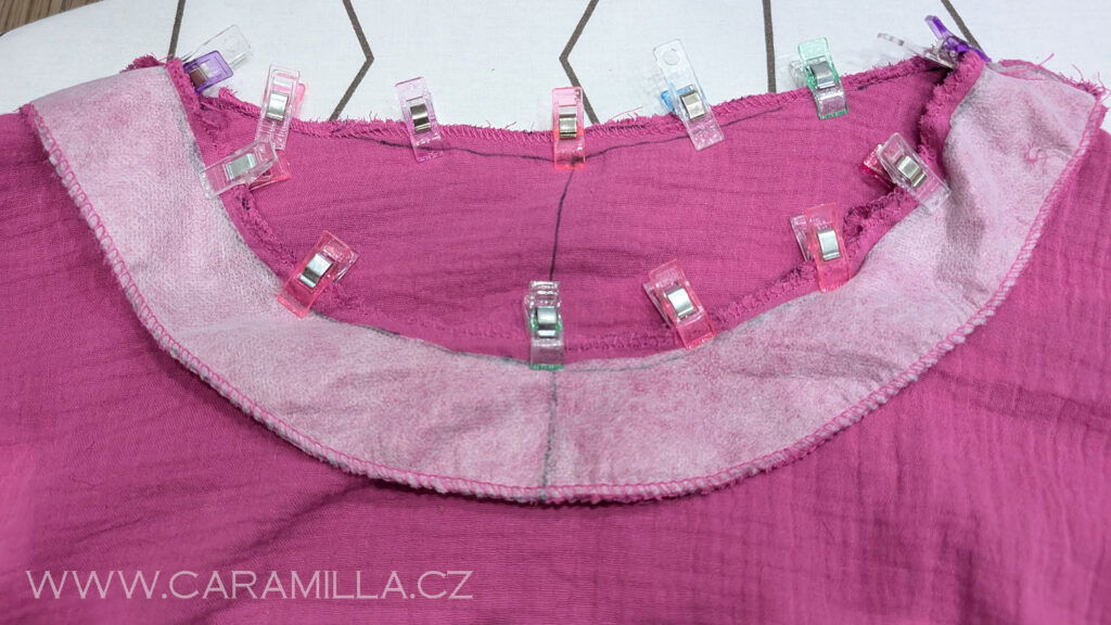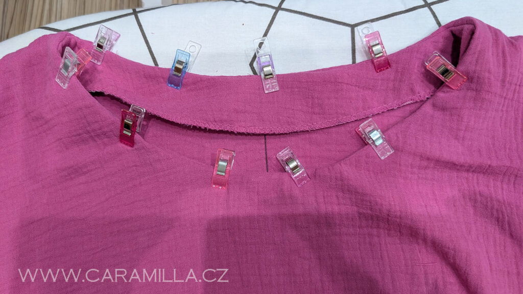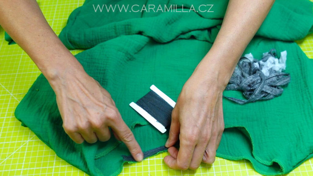 Proužek začneme našívat asi 5 cm od ramenního švu – začínám šít v zadním díle. A kousek 5 cm nechávám nesešitý, abych mohla později proužek po našití dokola spojit.
