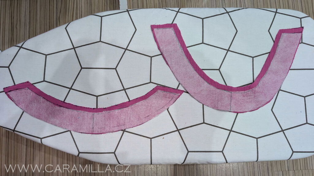 Obě sady dám dohromady lepidlem na rub látky. Následně zažehlím. Žehlím nejdříve na nižší stupeň ze strany vliselinu, aby se přichytil, poté pořádně již na vyšší stupeň přižehlím po látce.