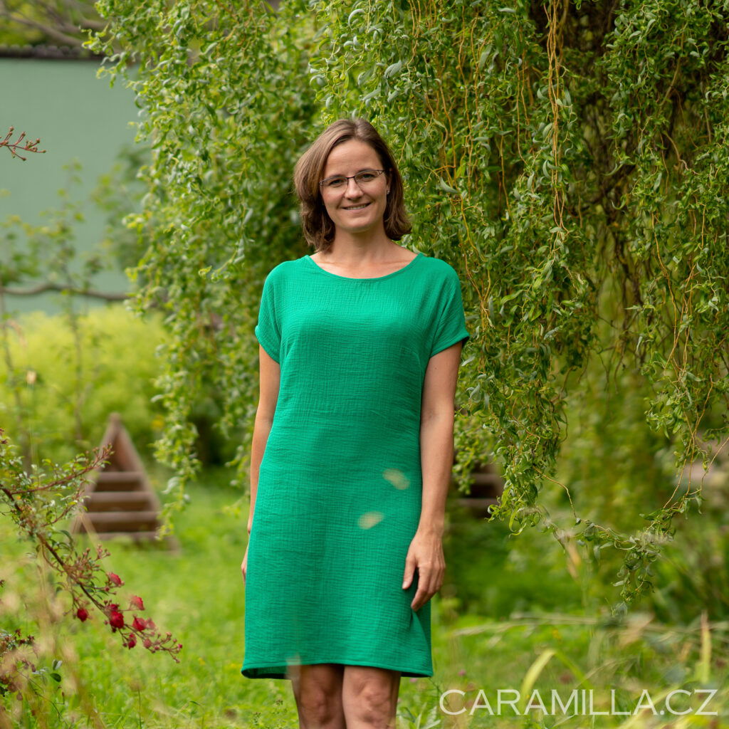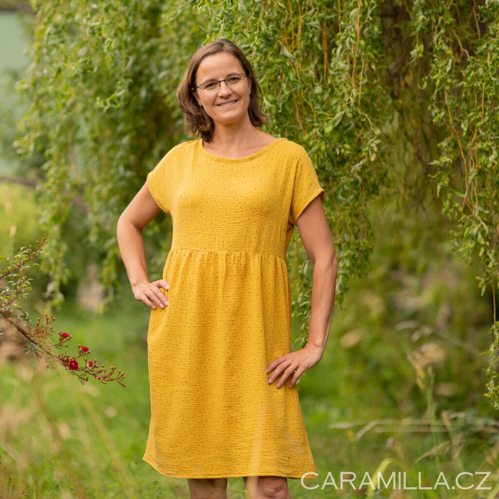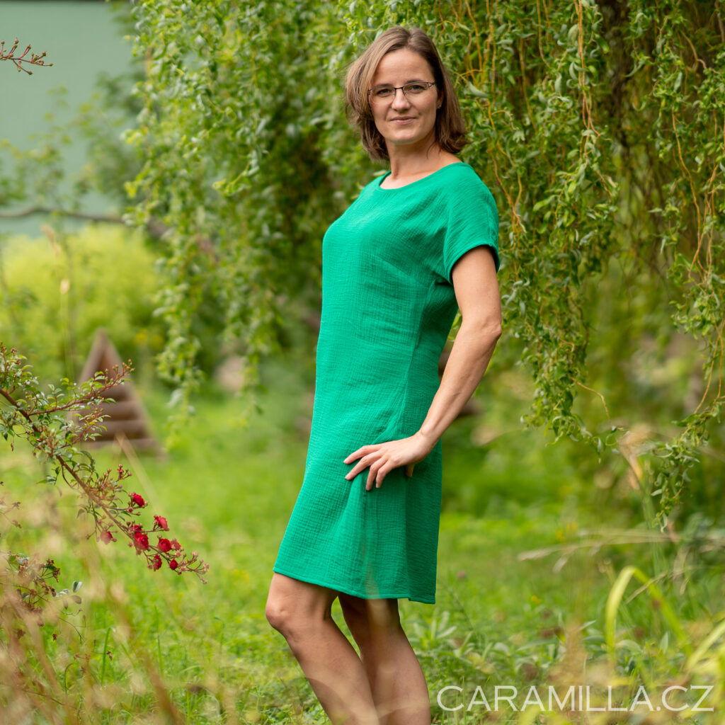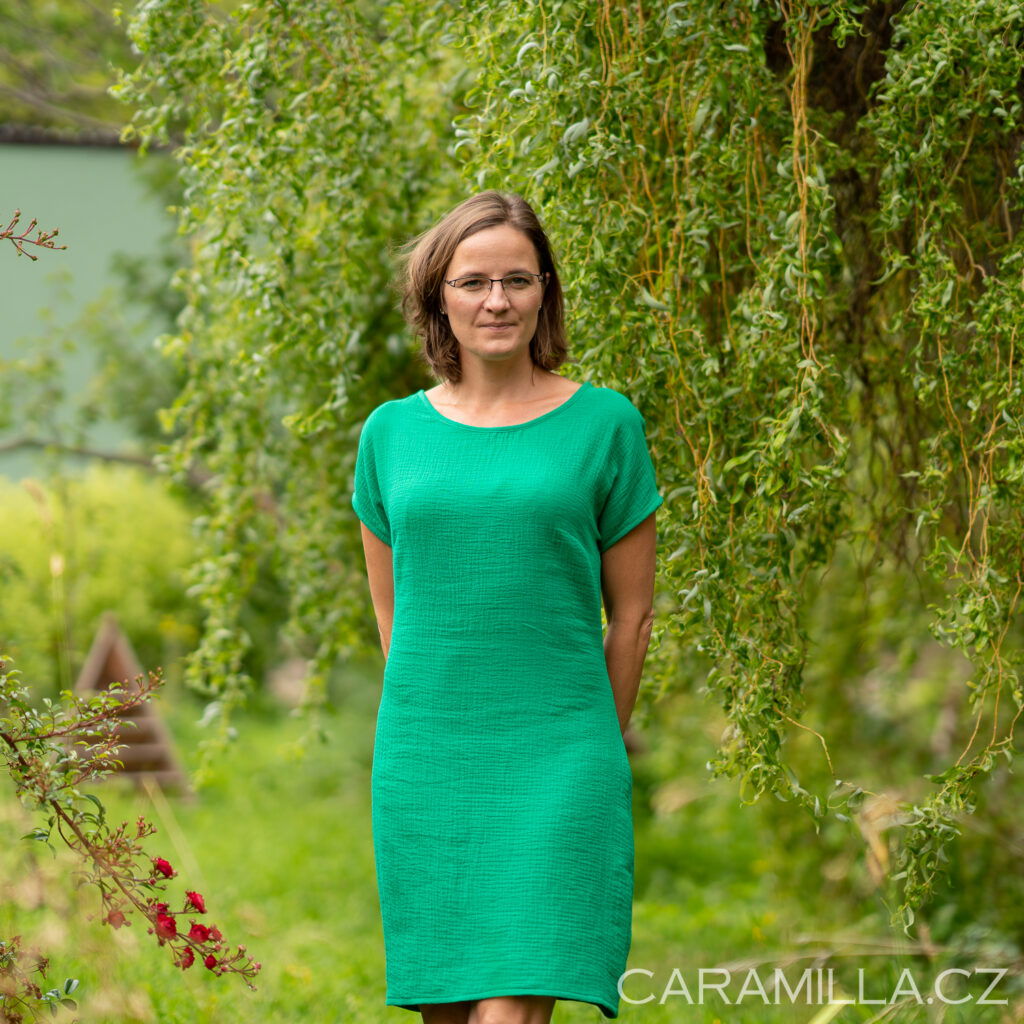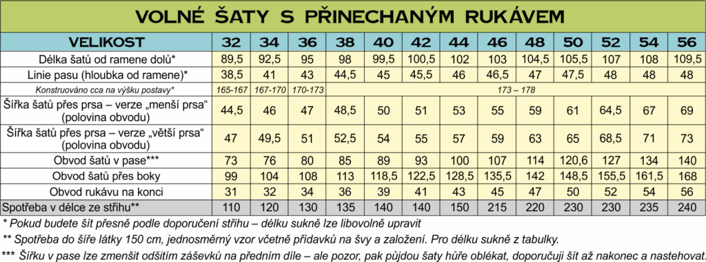 Doporučení pro výběr velikosti z tkaniny – obvod přes prsa u šatů by měl být cca o 15 cm víc než obvod přese prsa postavy, aby šaty byly dostatečně volné / plandavé a šly dobře obléci.