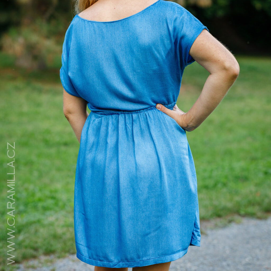 Šaty v celku mají ještě možnost záševků na předním díle. Můžete si je též vyznačit, ale odšití bych doporučovala až na konec, protože pas může být úzký pro oblékání. Doporučuji je nastehovat a zkusit si, zda budou šaty pohodlné pro oblékání a akorát volné.